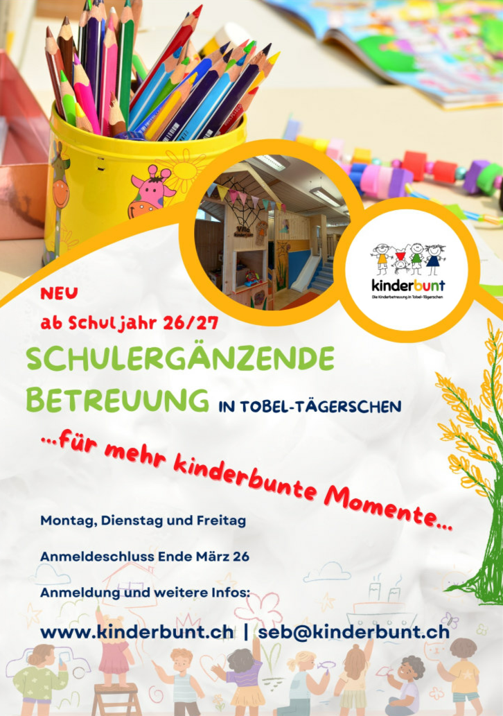 Jeweils am Montag, Dienstag und Freitag bieten wir die Schulergänzende Betreuung an der Primarschule Tobel an. Vor Beginn der Schule die Morgenbetreuung mit Zmorge, über den Mittag kochen, essen und betreuen wir die Kinder und nach der Schule oder dem Mittagstisch können die Kinder bei uns Hausaufgaben erledigen, basteln, spielen oder auch einfach einmal sein.